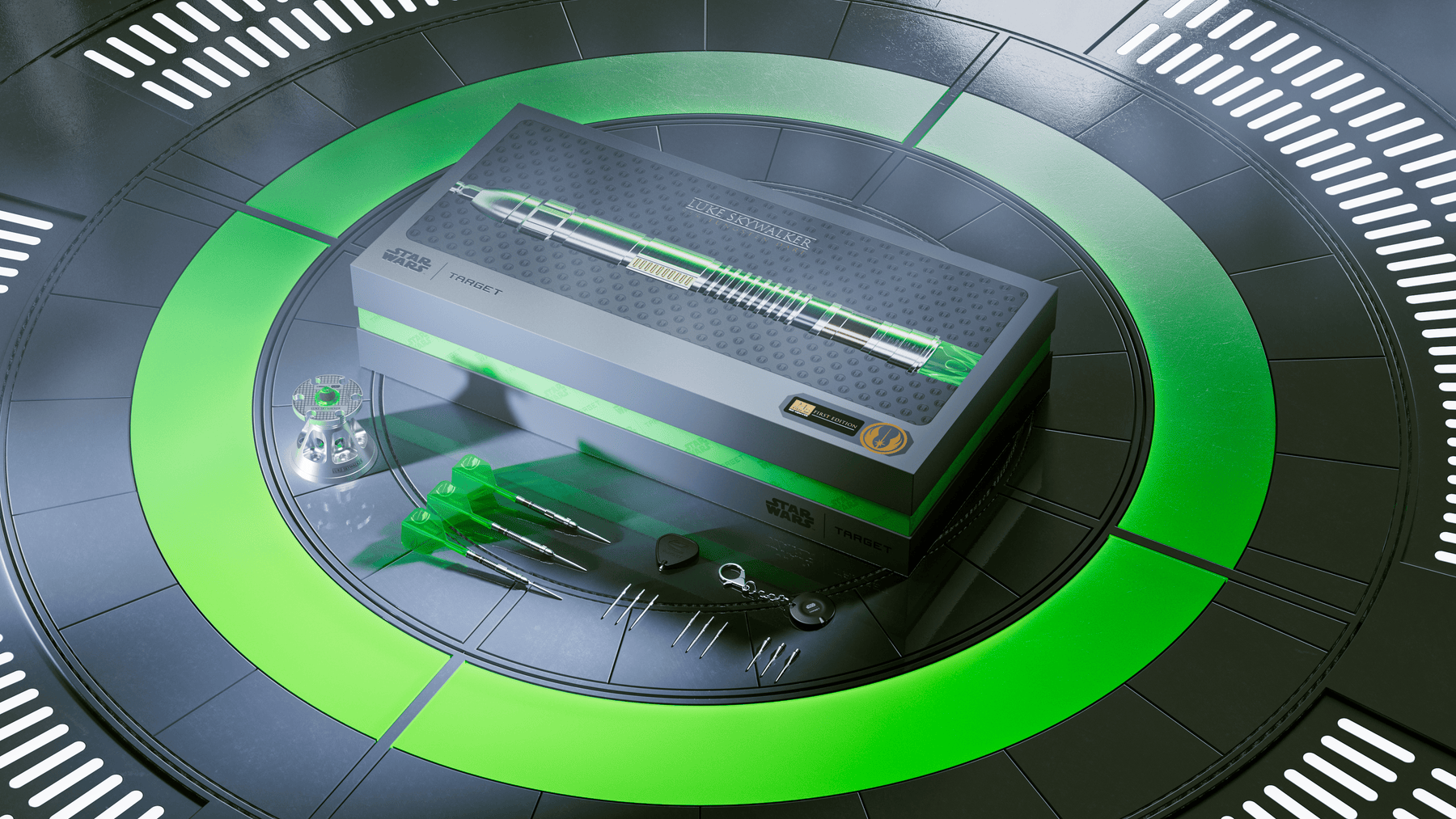 Feiere das Vermächtnis der Jedi mit den Star Wars Target Luke Skywalker Lightsaber Edition Darts – limitiert auf 2.000 Sets weltweit. In Zusammenarbeit mit Disney entwickelt, verkörpern sie Lukes legendäres grünes Lichtschwert in Form und Funktion. Die 95% Wolfram Barrels mit präzisen CNC-Gravuren bieten perfekte Balance und Kontrolle. Austauschbare Swiss Point Spitzen und transparente grüne K-Flex Flights sorgen für Vielseitigkeit und Stabilität. Mit Lichtschwert-Displayständer ist dieses Set ein echtes Sammlerstück.